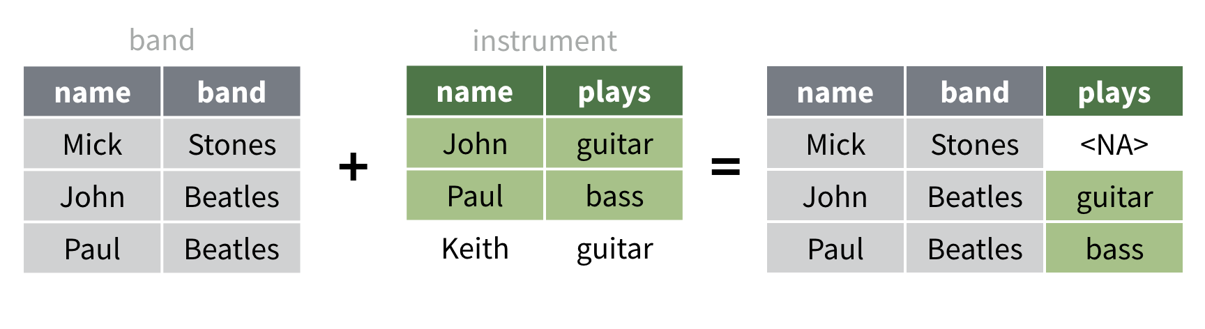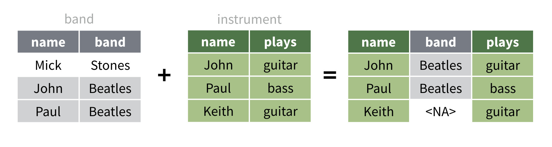 # A tibble: 3 x 3 name band plays <chr> <chr> <chr> 1 Mick Stones <NA> 2 John Beatles guitar3 Paul Beatles bass