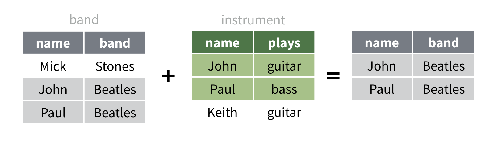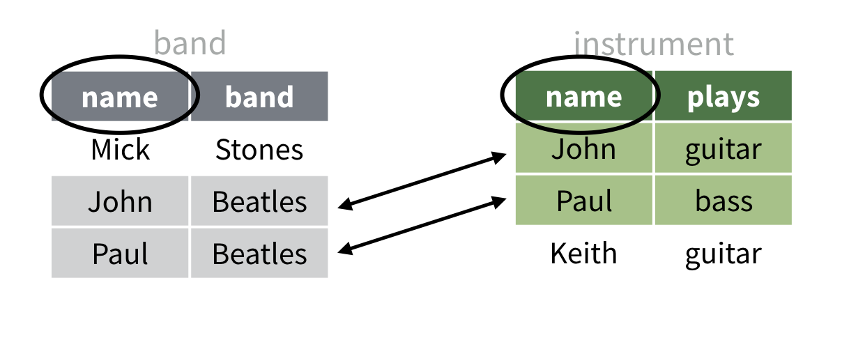 # A tibble: 3 x 2 name band <chr> <chr> 1 Mick Stones 2 John Beatles3 Paul Beatlesdplyr::band_instruments